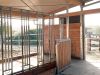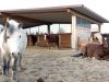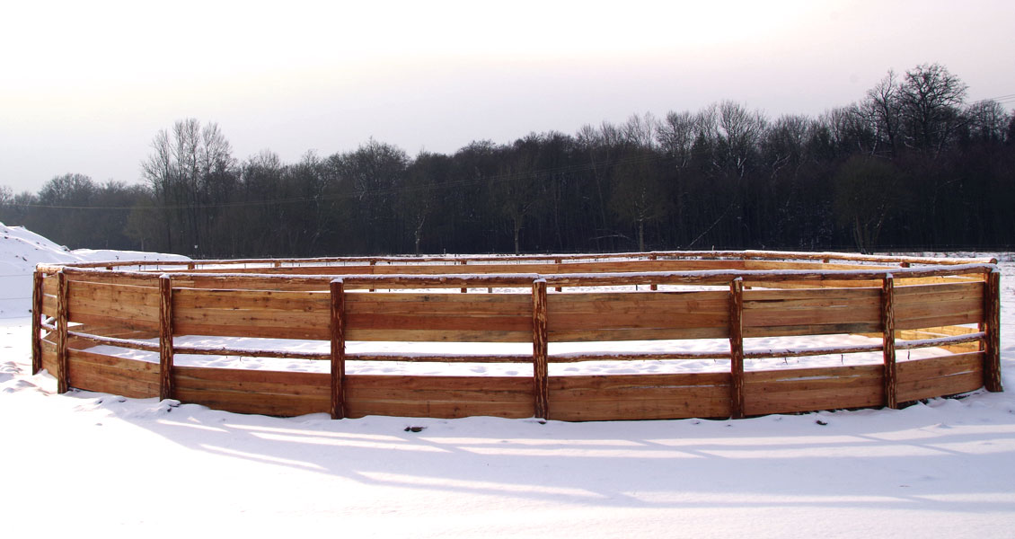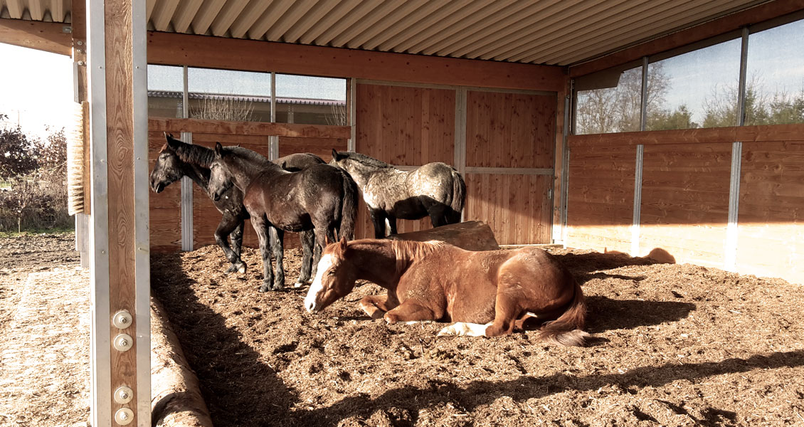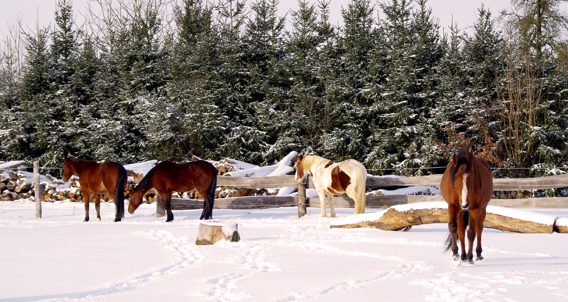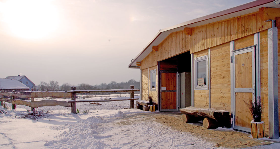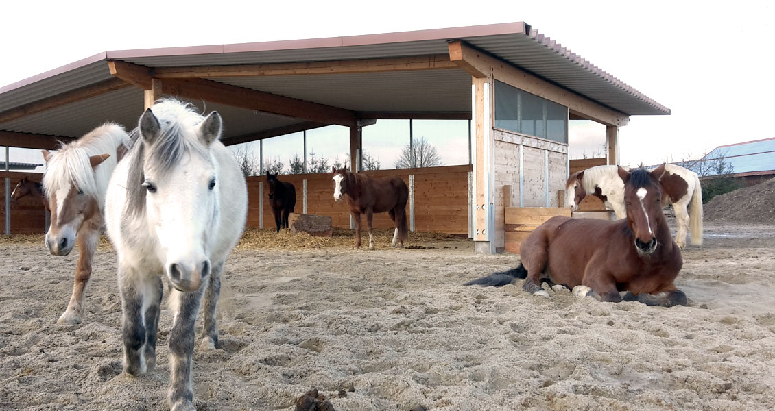 Die Fütterung erfolgt einerseits über Fressständer und andererseits über auf dem Trail verteilte Stroh- und Heuraufen. Dadurch werden die Pferde zu vermehrter Bewegung angeregt. Um die Fresszeiten zu verlängern bedecken Netze das Raufutter. Genau wie die Lecksteine befindet sich auch die Wasserstelle entfernt vom Stall auf dem Trail. Diese ist beheizbar und erlaubt den Pferden, von stehendem Wasser in der richtigen Höhe zu trinken. Inmitten der Anlage befindet sich die 130 m² große Liegehalle. Für optimale Frischluftzufuhr sorgen hier Windschutznetze und eine offene Südseite. Eingestreut wird hier mit Grünkompost, da dieser von den Pferden nicht gefressen wird, und sie sich damit wirklich nur zum Ruhen einfinden. Raumteiler sorgen für ein entspanntes Liegeverhalten aller Pferde. Da es bei uns keinen geschlossenen Stall im herkömmlichen Sinne gibt, entscheiden unsere Pferde selbst, wo sie sich aufhalten wollen. Mehr Klimareize gehen nicht …