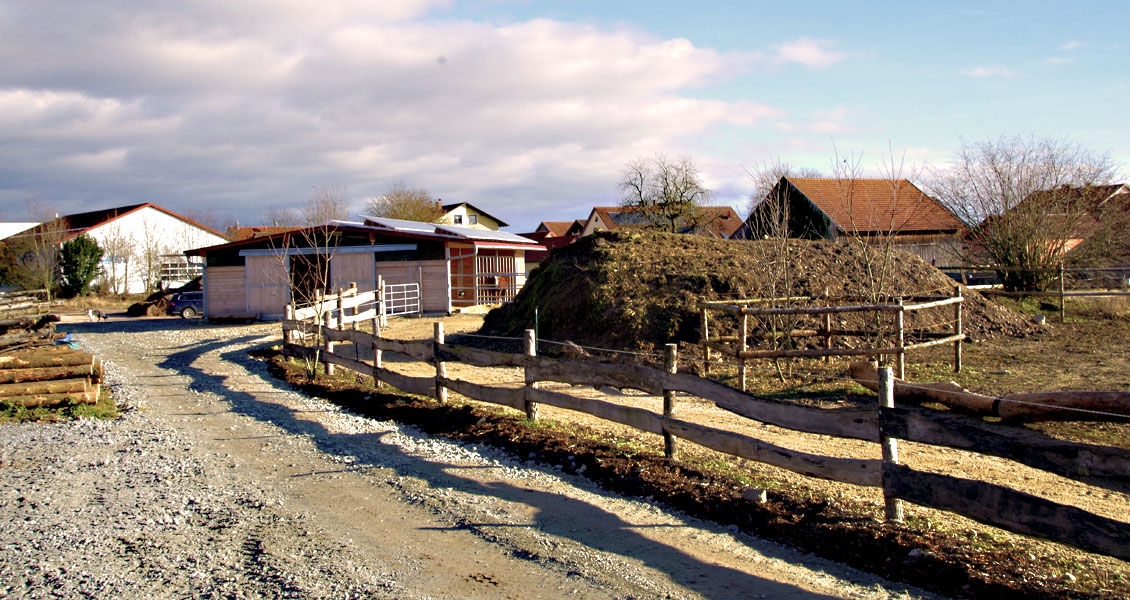 Kern unserer Anlage ist der „Trail“, ein ca. 550 m langer, befestigter Rundweg. Er besteht zum Großteil aus Sand, aber auch Schotter, Hackschnitzel und Naturboden, um die Pferde auf unterschiedliche Untergründe vorzubereiten. Insgesamt steht ihnen dauerhaft eine Fläche von etwa 3500 m² zur Verfügung. Dazu kommen noch 2 ha Weideflächen.